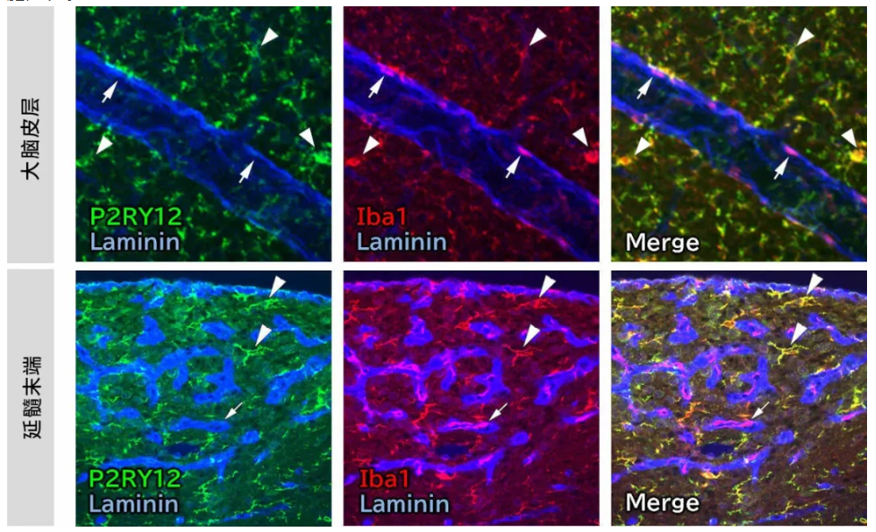 P2RY12(也稱為P2Y12)是一種腺苷5'-二磷酸(ADP)受體,也是嘌呤能G蛋白偶聯(lián)受體P2Y家族的成員。它在外周組織的血小板中表達,也在中樞神經(jīng)系統(tǒng)的穩(wěn)態(tài)小膠質(zhì)細胞(Homeostatic Microglia)中特異性表達。由于P2RY12幾乎不在巨噬細胞中表達,所以它是用于區(qū)分存在腦血管周圍的巨噬細胞和小膠質(zhì)細胞的有效標志物1)。此外,ADP可用作細胞損傷的信號,小膠質(zhì)細胞中的P2RY12被認為在接收神經(jīng)細胞損傷方面發(fā)揮作用。